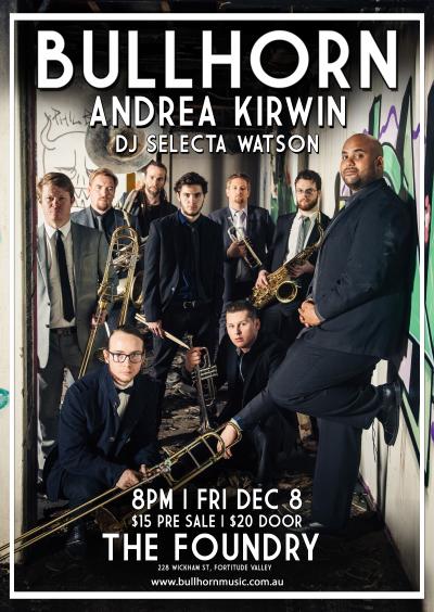 There’s an old saying, popularised by The Breakfast Club: “you mess with the bull, you get the horns”. What does it mean? Not much really. Mostly that if you do something dangerous, you might get hurt. One dangerous thing you could do would be to miss the crazy, brass based, MC led explosion that is BULLHORN at The Foundry Friday December 8th. Joining them on stage will be the smooth soulful tones of Sunshine Coast's Andrea Kirwin.